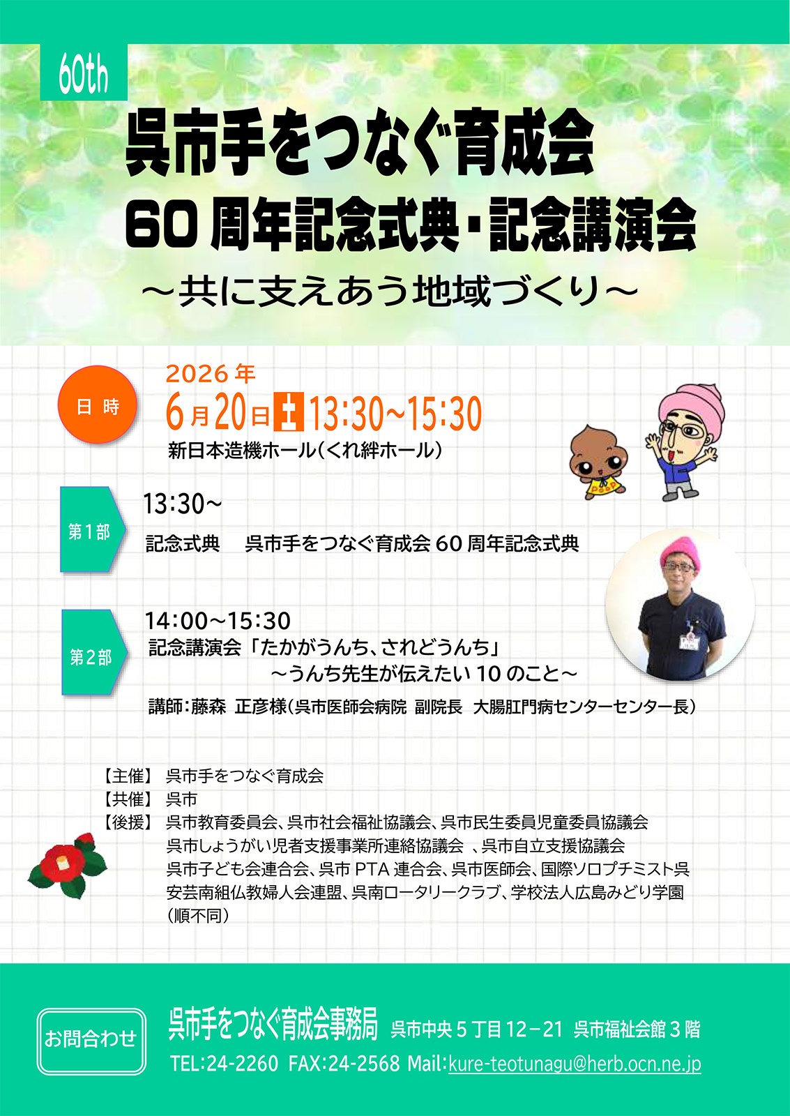 日 時:令和8年6月20日(土)13:30~15:30 場 所:新日本造機ホール(くれ絆ホール) 詳細は添付のチラシをご覧ください。